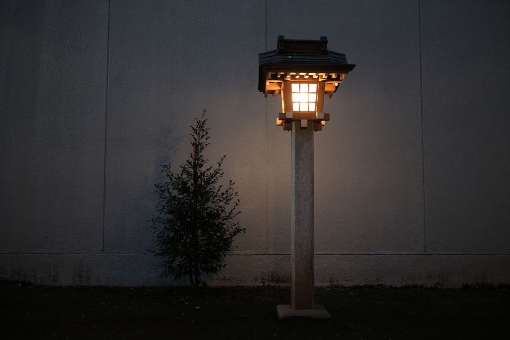 A lantern and a tree at a shrine in Tokyo, Japan.