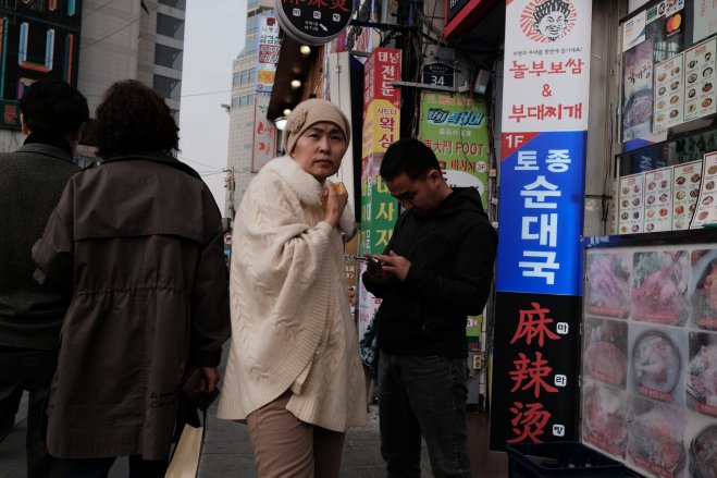 Man smoking in front of store, Seoul, South Korea A man smoking in front of a store in Seoul, South Korea.