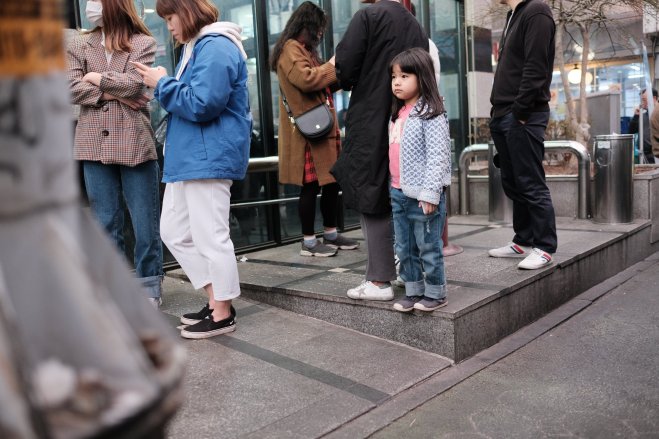 Girl waiting outside restaurant, Seoul, South Korea A girl stands waiting outside a restaurant in Seoul, South Korea.