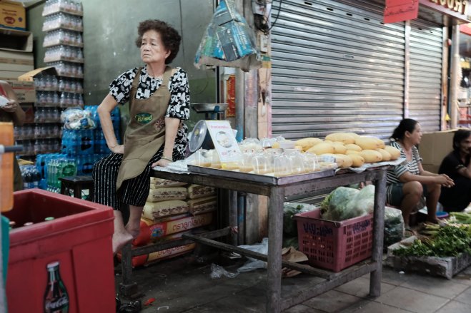Woman sitting on table, Bangkok, Thailand A woman sits on a table outside a grocery store in Bangkok, Thailand.