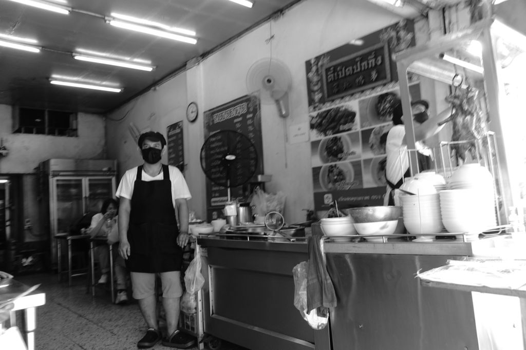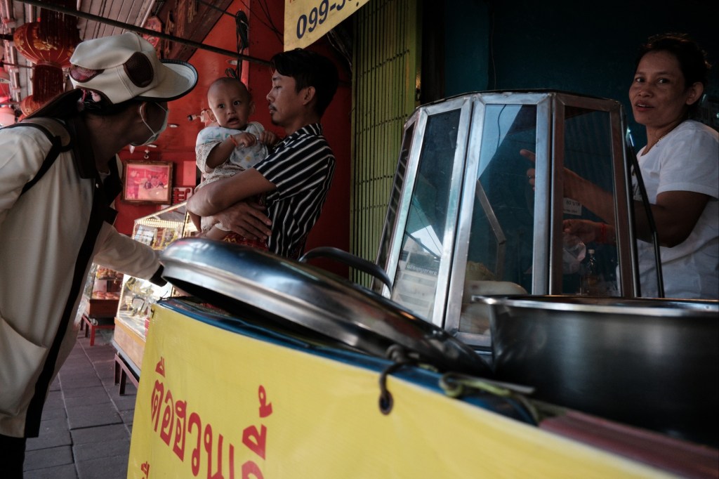 A boy behind the counter of a street kitchen in Bangkok, Thailand.