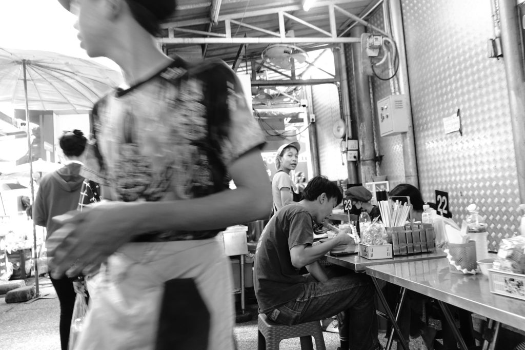 People sitting at a table in a street kitchen in Chiang Mai, Thailand.