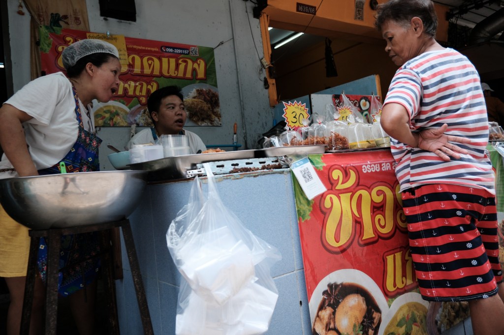 A woman cleaning utensils at a street kitchen in Chiang Mai, Thailand.
