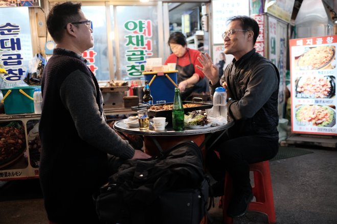 Two men having dinner, Seoul, South Korea Two men having dinner at a street kitchen in Seoul, South Korea.