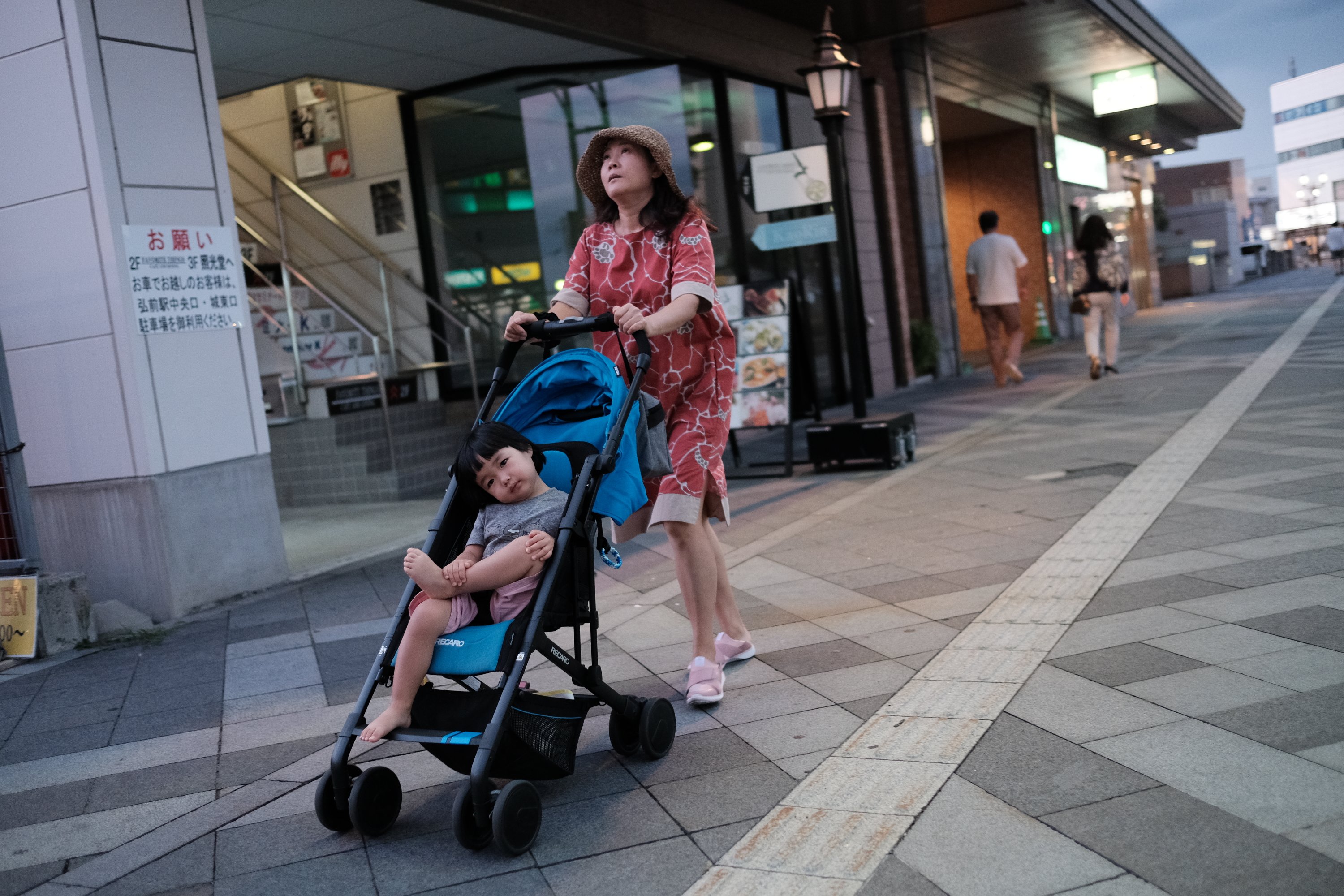 A mother pushing her daughter in a stroller in Hirosaki, Japan.