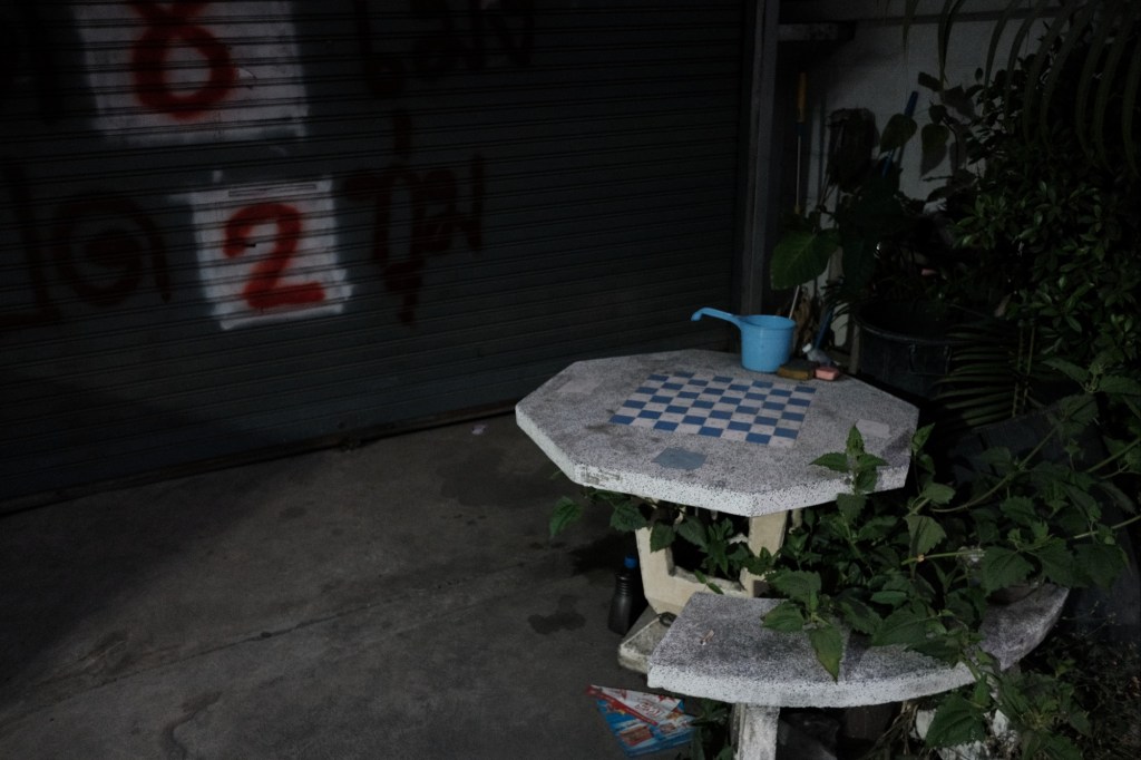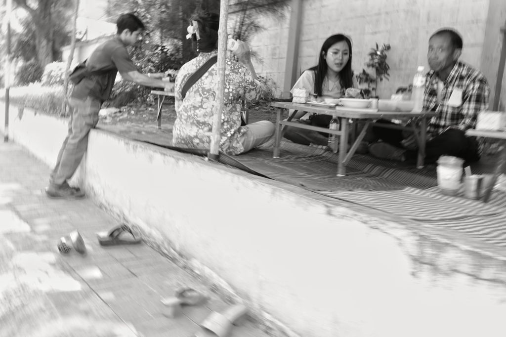 People sitting at a table in a street kitchen in Chiang Mai, Thailand.