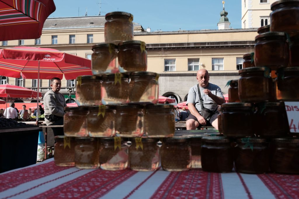 A man sitting on a table at Tržnica Dolac (Dolac Market) in Zagreb, Croatia.