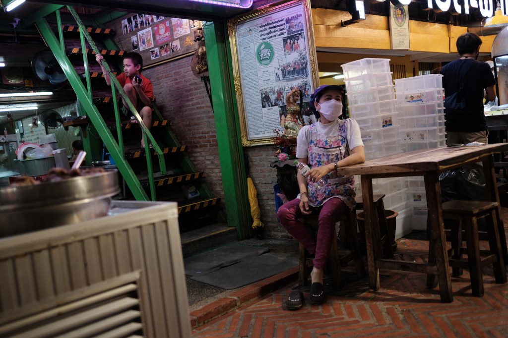 People sitting at a table in a street kitchen in Chiang Mai, Thailand.