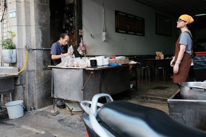 Woman with yellow bandana, Taipei, Taiwan Morning preparations at a street kitchen in Taipei, Taiwan.