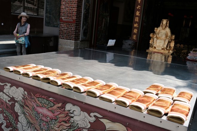 Offerings and golden statue, Taipei, Taiwan A table with offerings and a golden statue in front of Xiahai City God Temple in Taipei, Taiwan.
