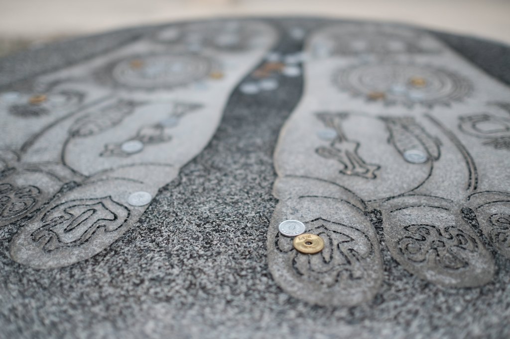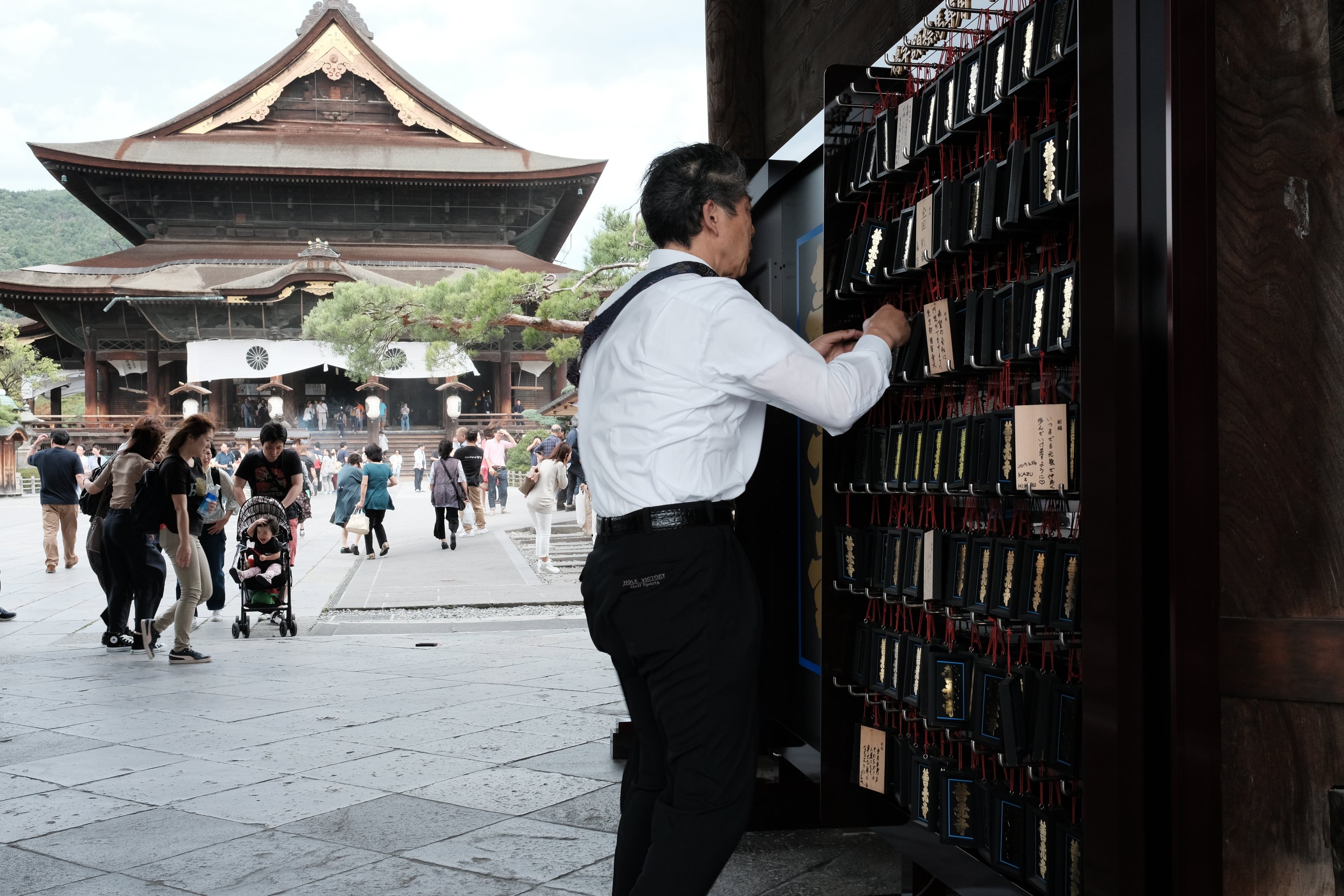 Man hanging plaques, Nagano, Japan A man hangs plaques that have been blown around on a windy day at Zenkō-ji in Nagano, Japan.