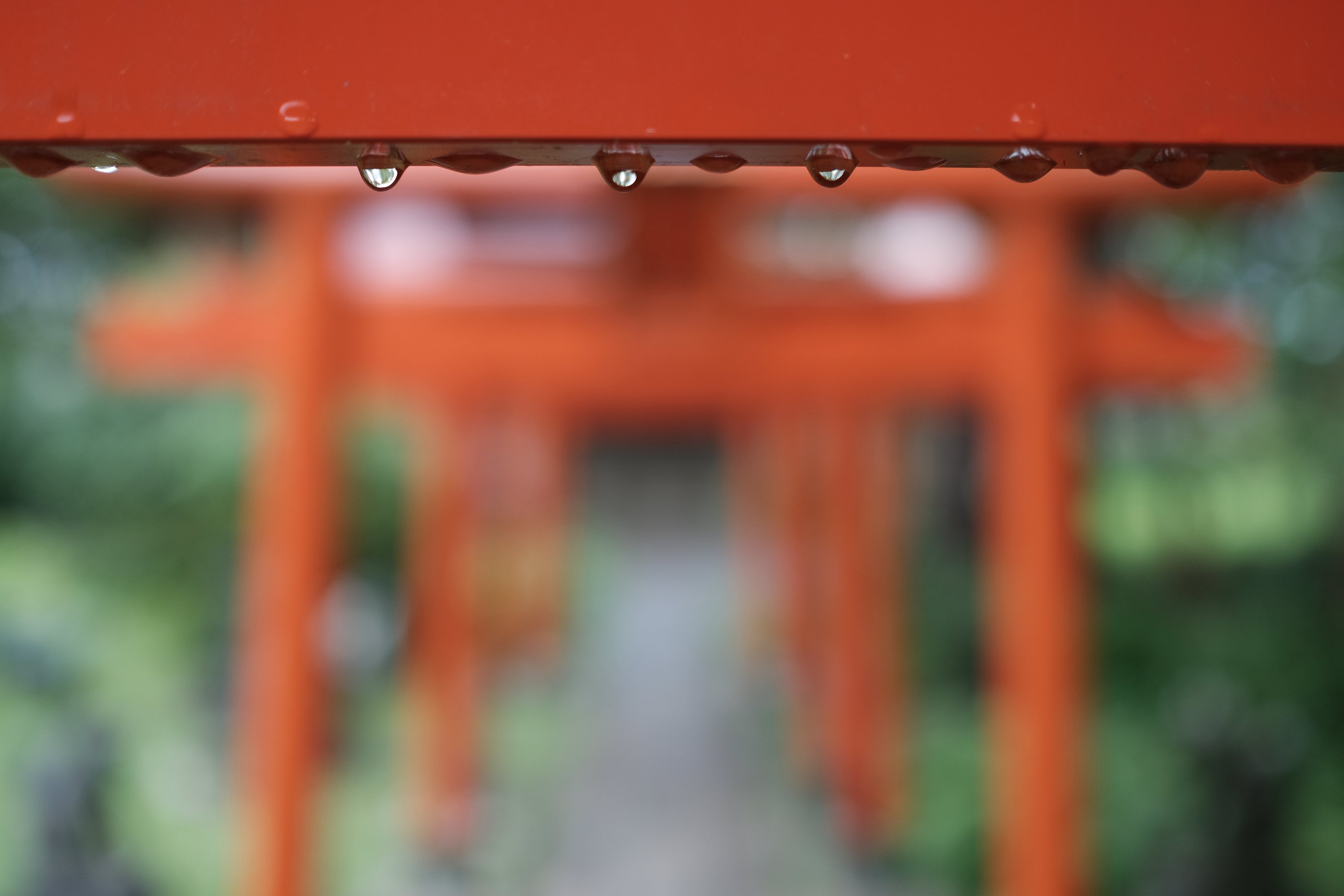 Water droplets and torii, Akita, Japan Water droplets hanging from the torii at Hachiman-jinja after a rainstorm in Akita, Japan.
