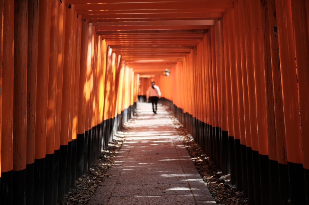 Woman walking through torii, Kyōto, Japan A woman walking through the torii at Fushimi Inari-taisha in Kyōto, Japan.