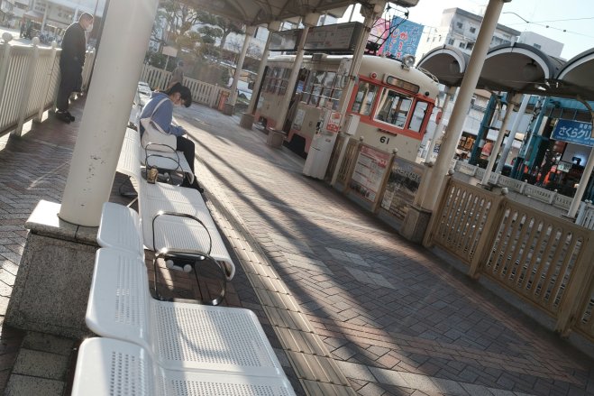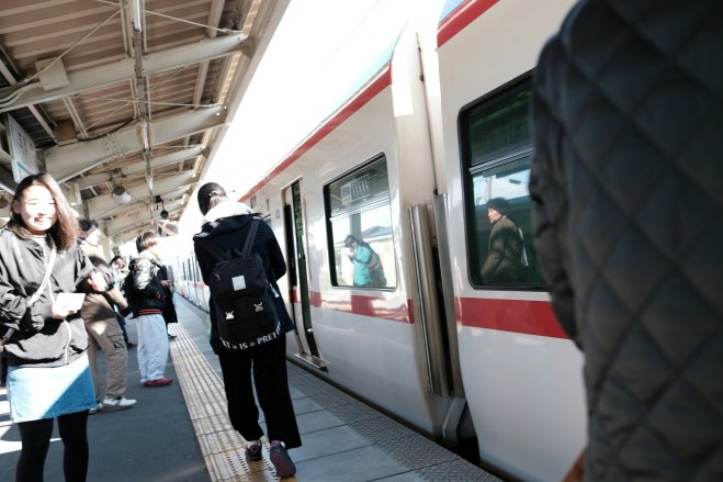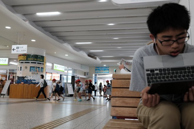 A boy with his computer and kids going on a field trip at the train station in Miyazaki, Japan.