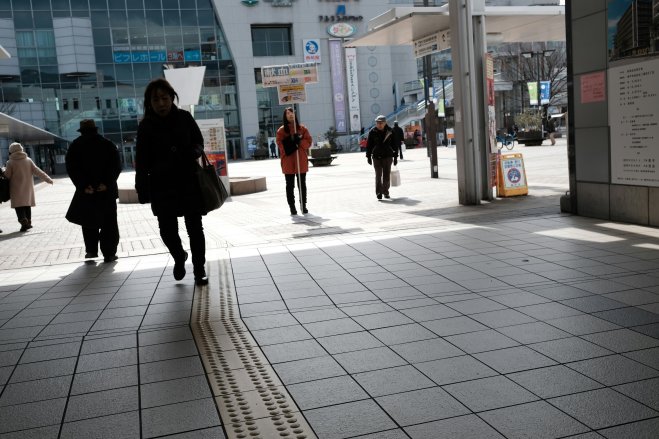 A woman holds a sign seeking blood donations at an exit from a train station in Kōbe, Japan.