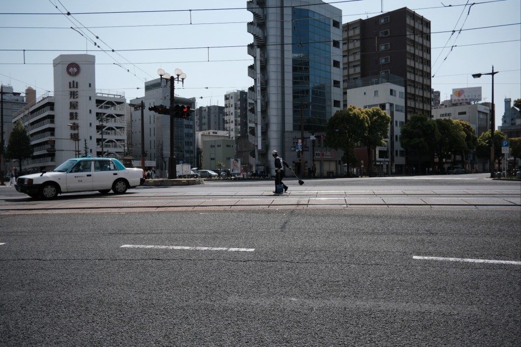 A man sweeping the tram tracks in Kagoshima, Japan.