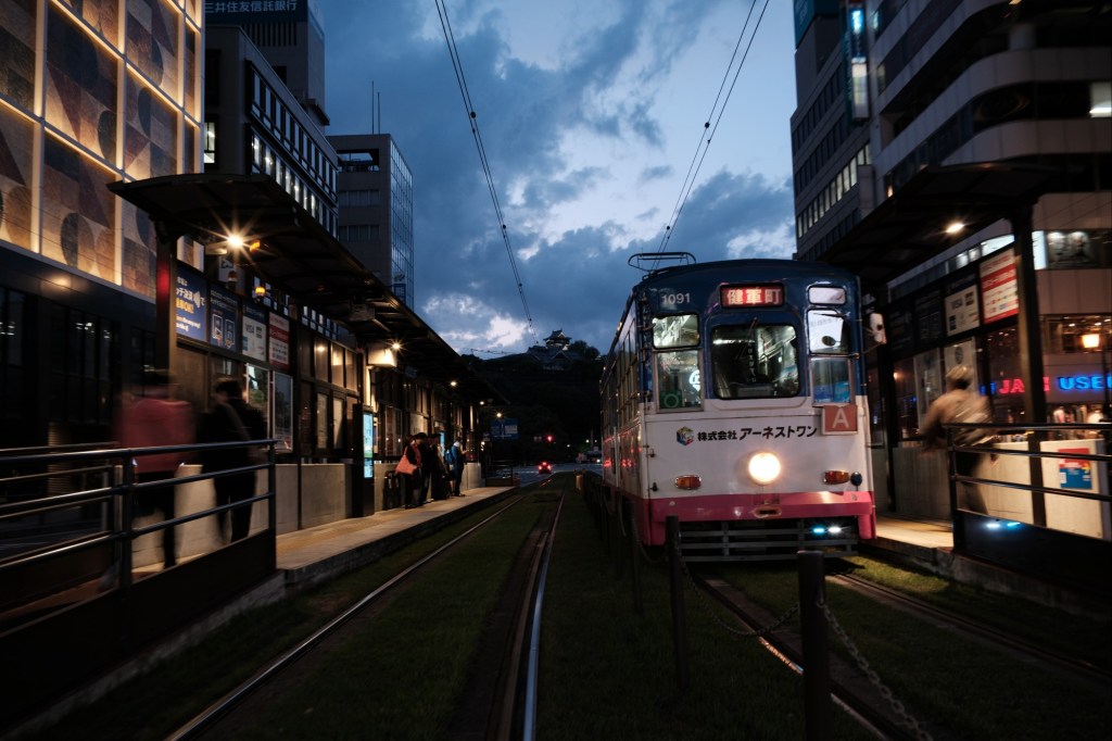 A tram and Kumamoto-jō in Kumamoto, Japan.