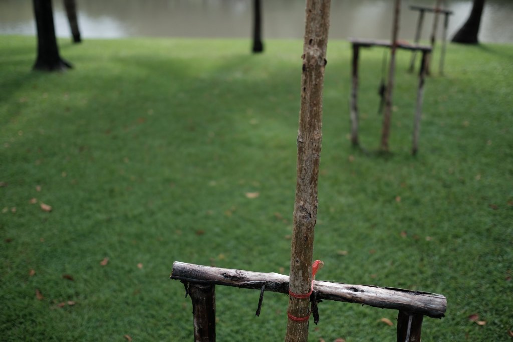 A bridge and bamboo forest at the Hamamatsu Castle Park Japanese Garden in Hamamatsu, Japan.