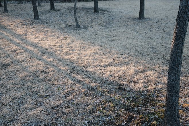 Brown grass, tree trunks, and long shadows at a park in Daejeon, South Korea.