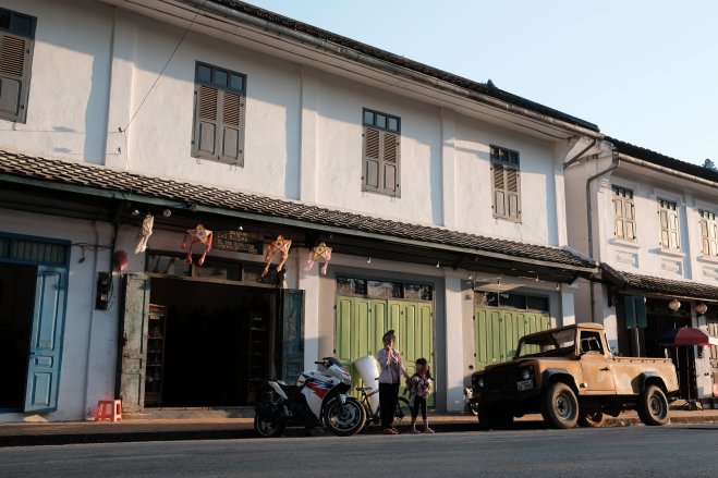 Two girls crossing the street, Luang Prabang, Laos Two girls looking before crossing the street in Luang Prabang, Laos.