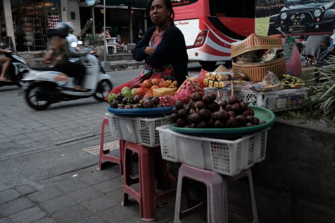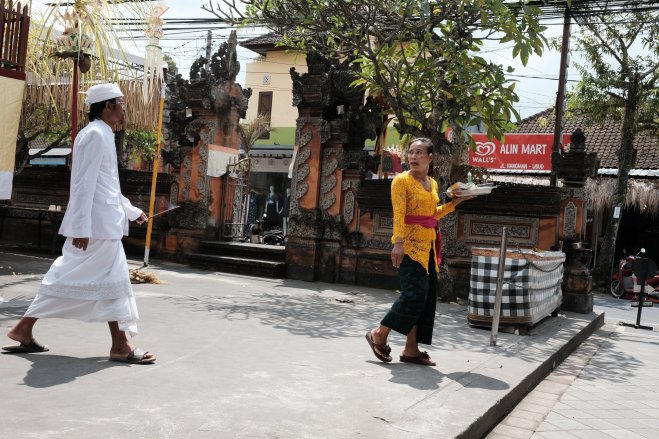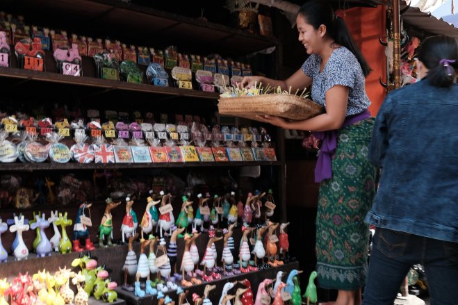 Lady at a souvenir shop, Ubud, Indonesia A lady places an offering at a souvenir shop in Ubud, Indonesia.