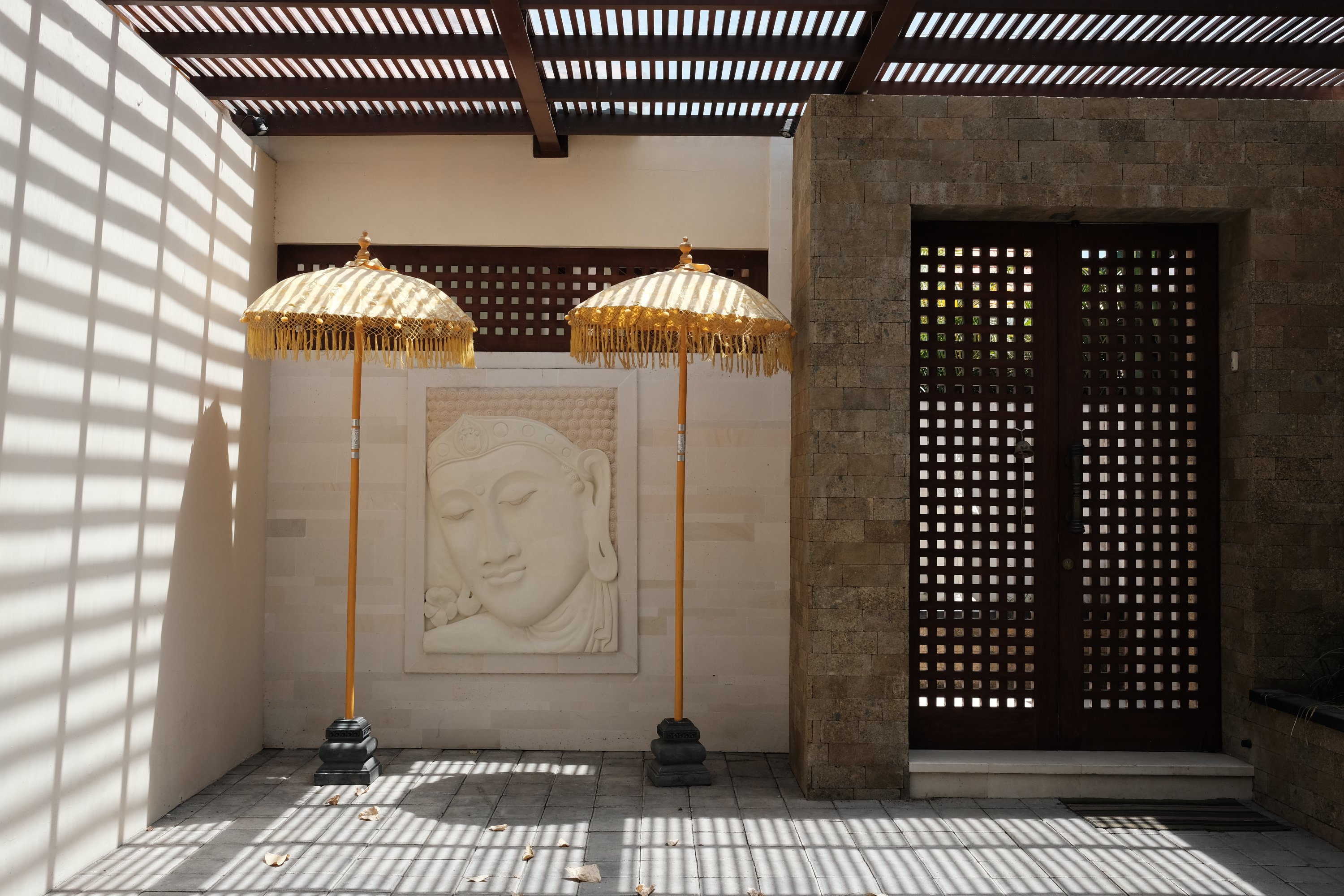 Buddha and yellow umbrellas, Sanur, Indonesia A Buddha relief and two yellow umbrellas in Sanur, Indonesia.