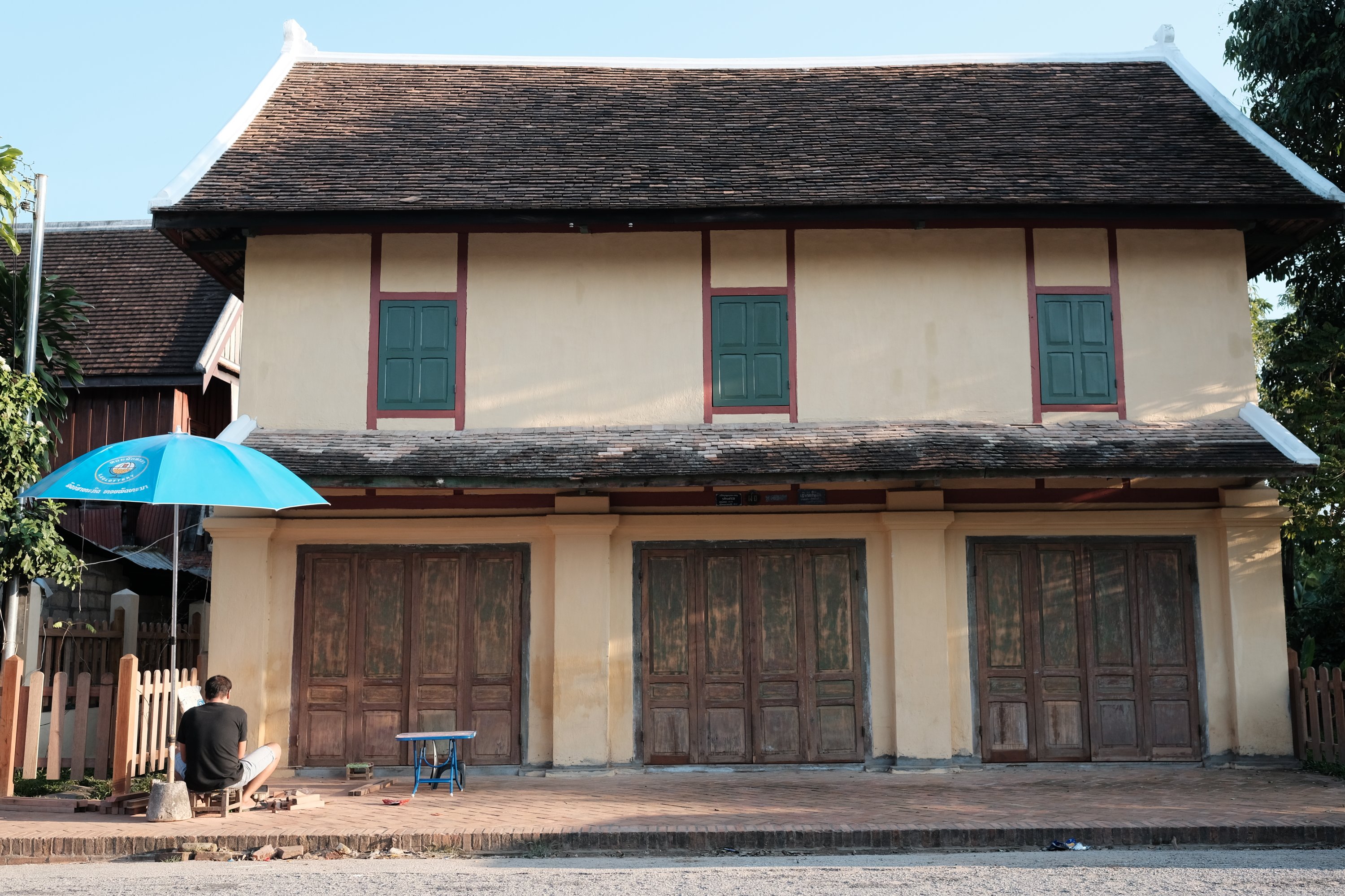 Man and blue umbrella, Luang Prabang, Laos A man working on the sidewalk under a blue umbrella in Luang Prabang, Laos.