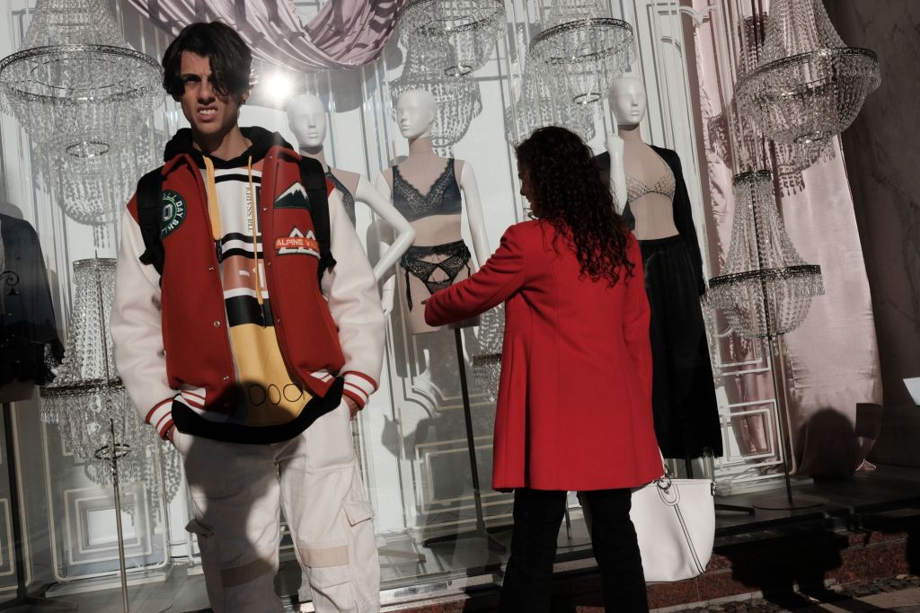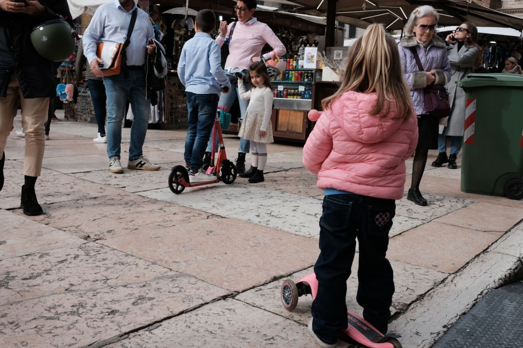 Girl meets girl at Piazza delle Erbe in Verona, Italy.