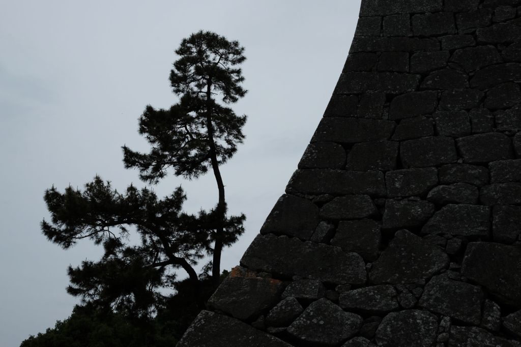 A tree and the castle wall of Matsuyama-jō in Matsuyama, Japan.