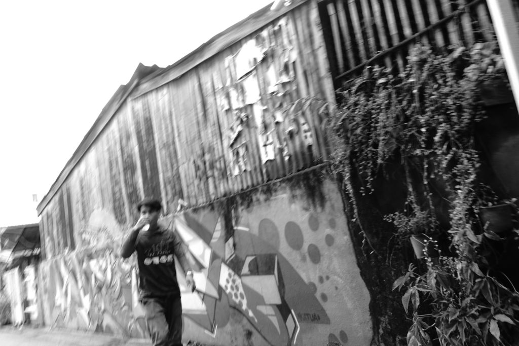 A guy walking by a graffiti wall in Chiang Mai, Thailand.
