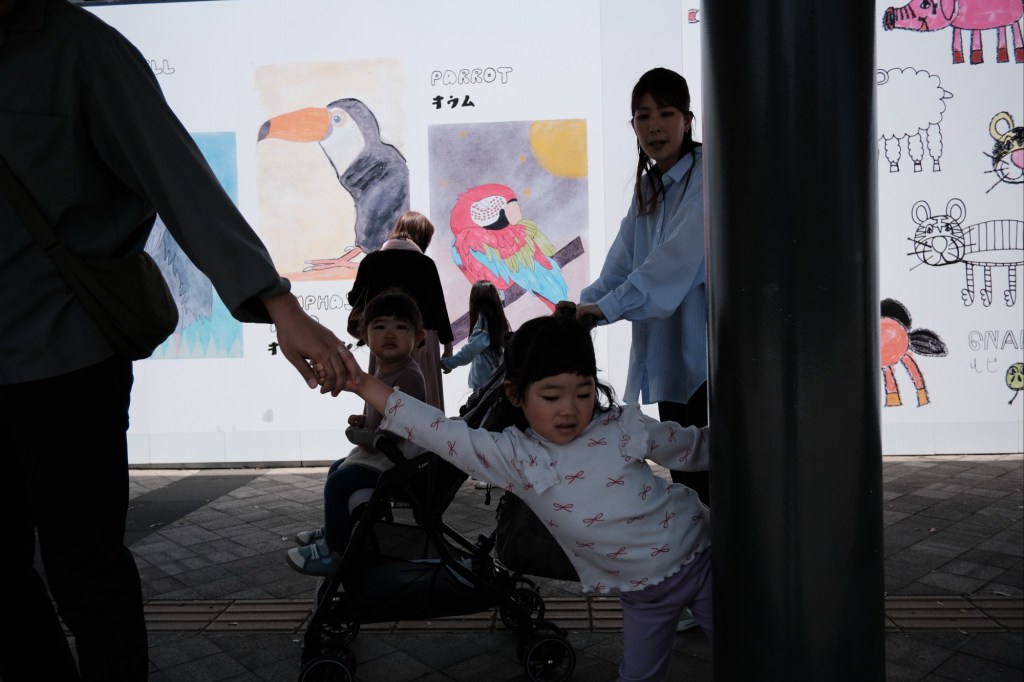 People by an art wall in Ōita, Japan.