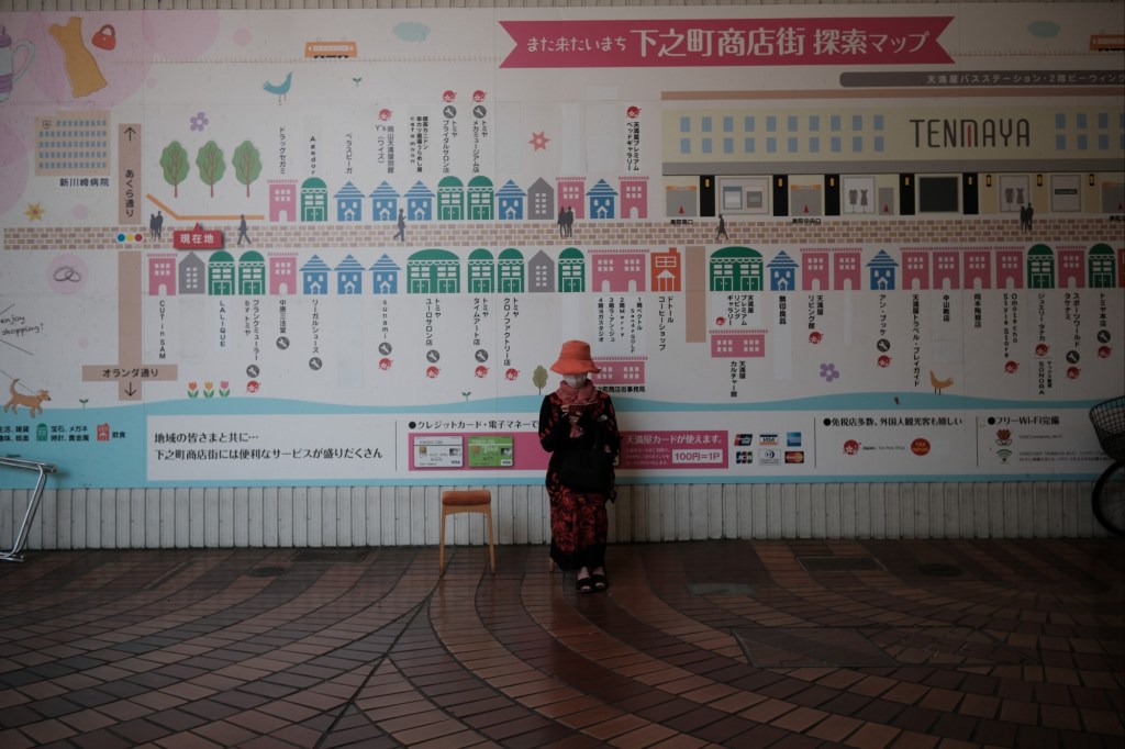 A lady sitting by a wall map in Okayama, Japan.