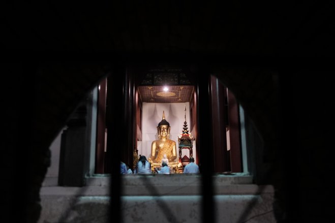 Buddha through a window, Chiang Mai, Thailand A statue of Buddha viewed through a window at Wat Jetlin in Chiang Mai, Thailand.