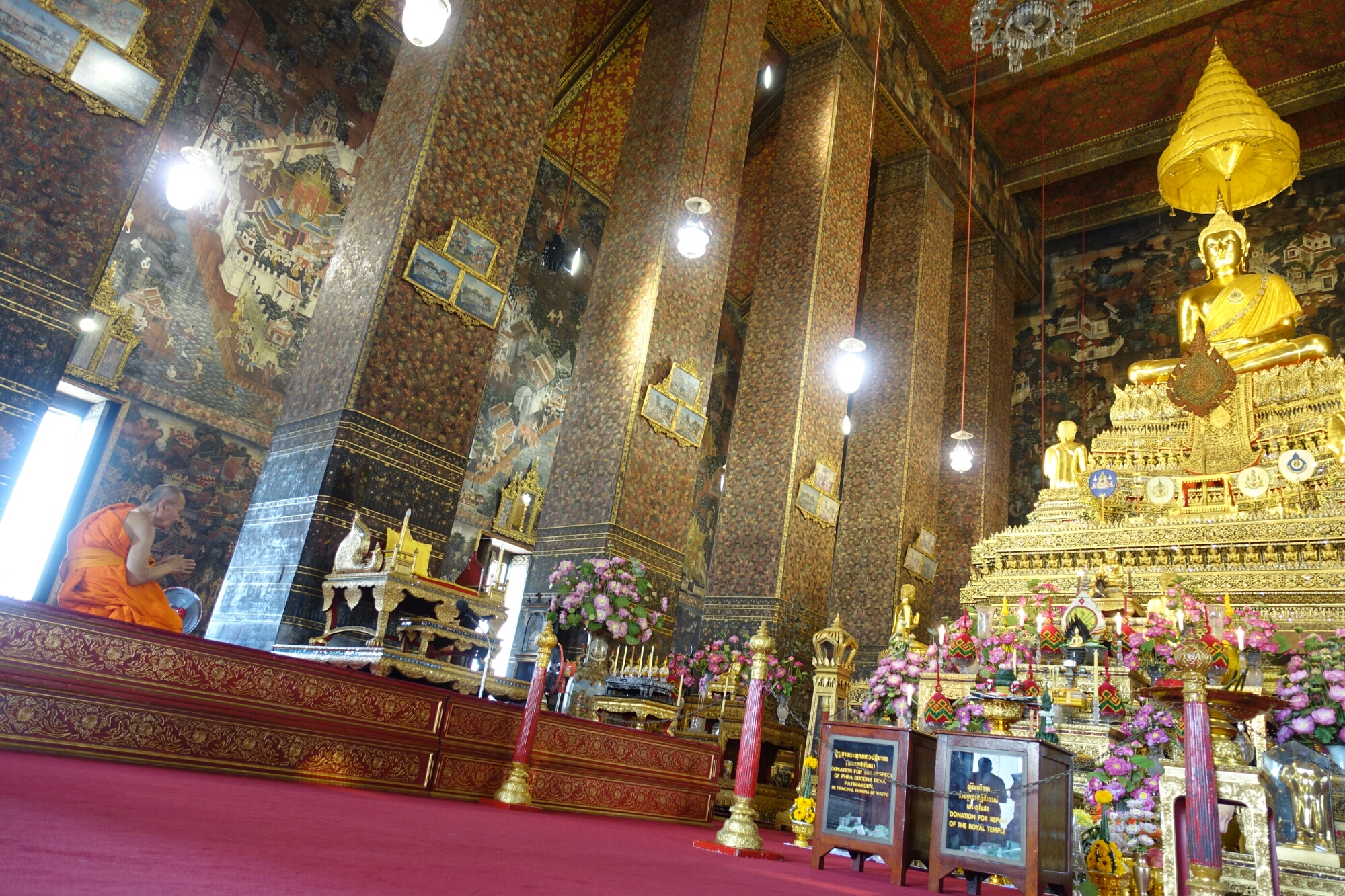 Monks chanting, Bangkok, Thailand Inside the bot at Wat Pho, I am humbled as I experience the sights and the sounds of monks chanting before the golden Buddha in Bangkok, Thailand.