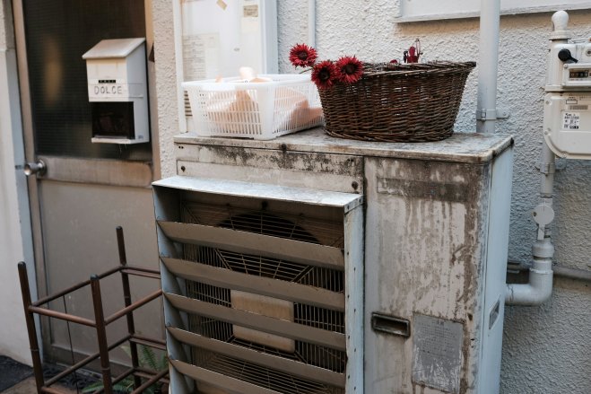 Red flowers, Tokyo, Japan Red flowers in a basket on a vent found in a narrow alleyway in Yanaka, Tokyo, Japan.